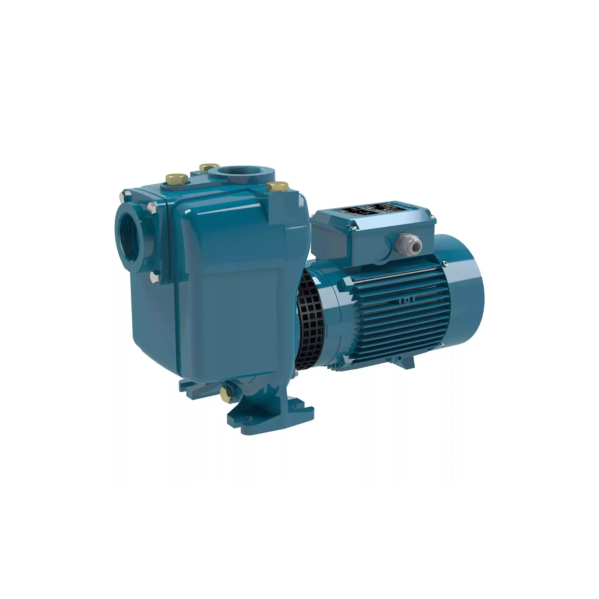 The A series re‑primes itself automatically even if suction piping is empty or only partially flooded. Flows range from about 3.6 to 66 m³/h, with heads up to 33.6 m and power up to around 7.5 kW. Built‑in backflow prevention stops reverse siphoning on shutdown. Suitable for draining basins or sumps, civil and industrial irrigation, or clean/slightly dirty fluid applications with maximum solid sizes of around 10–15 mm depending on model.